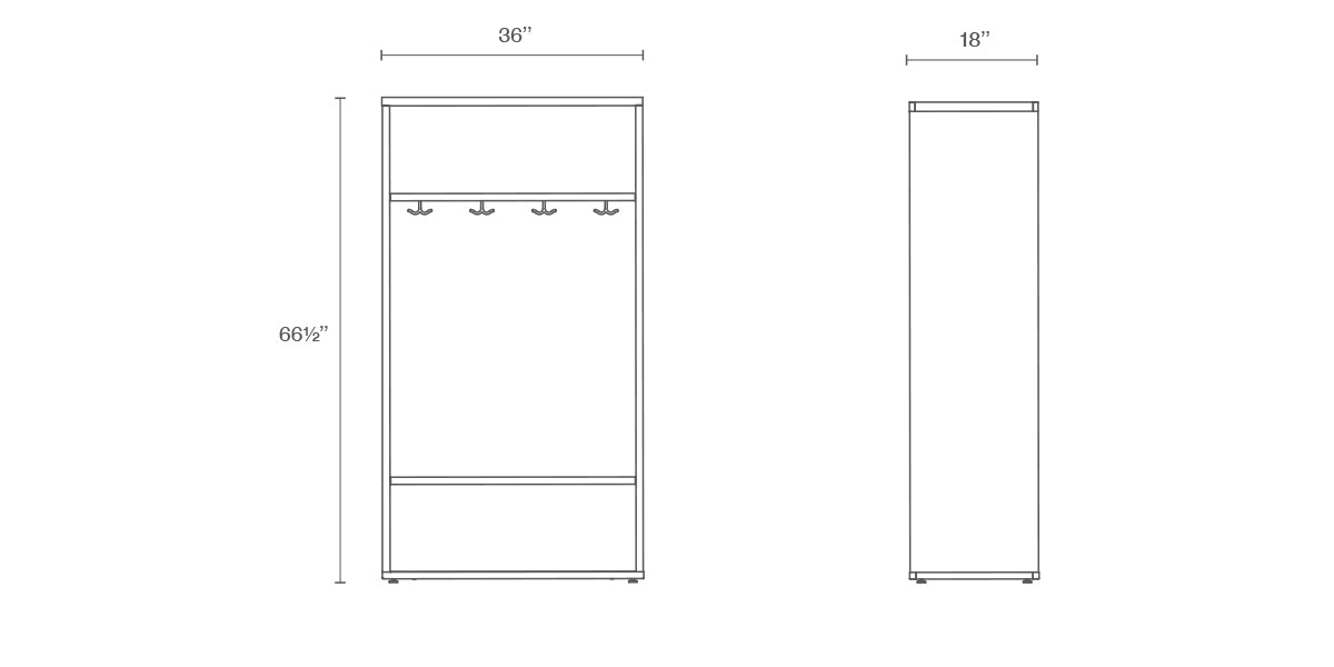 • Four dual-prong coat hooks mounted beneath upper shelf