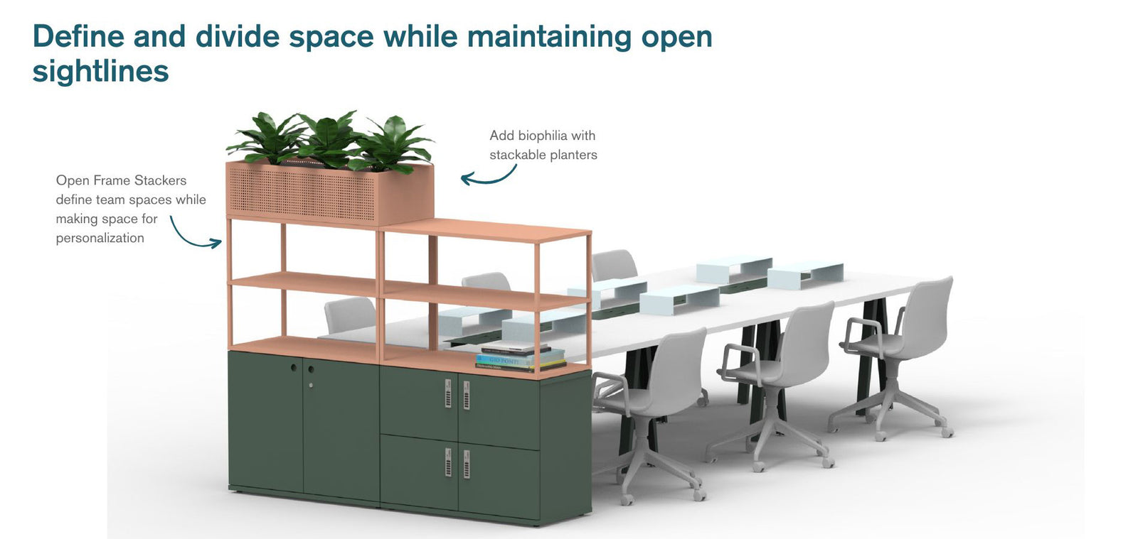 • Shown with 6 fixed height, 60W x 26D surfaces with integrated cable management trough