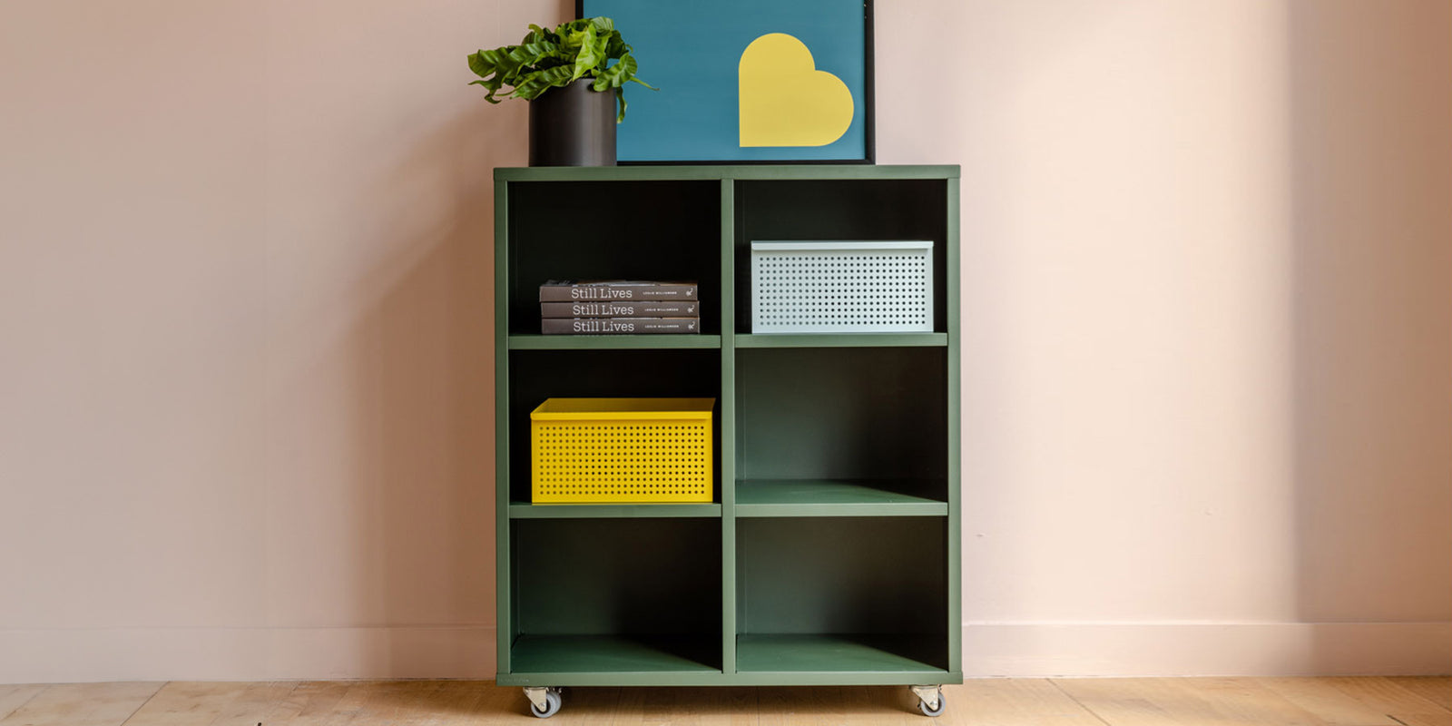 We think of our Building Block collection as adult Legos: modular, colorful, and able to be configured in a myriad of functional tableaus. Fixed shelves and closed backs create equal sized cubbies to accommodate whatever you need to store, from shoes to bags, to books, and beyond.