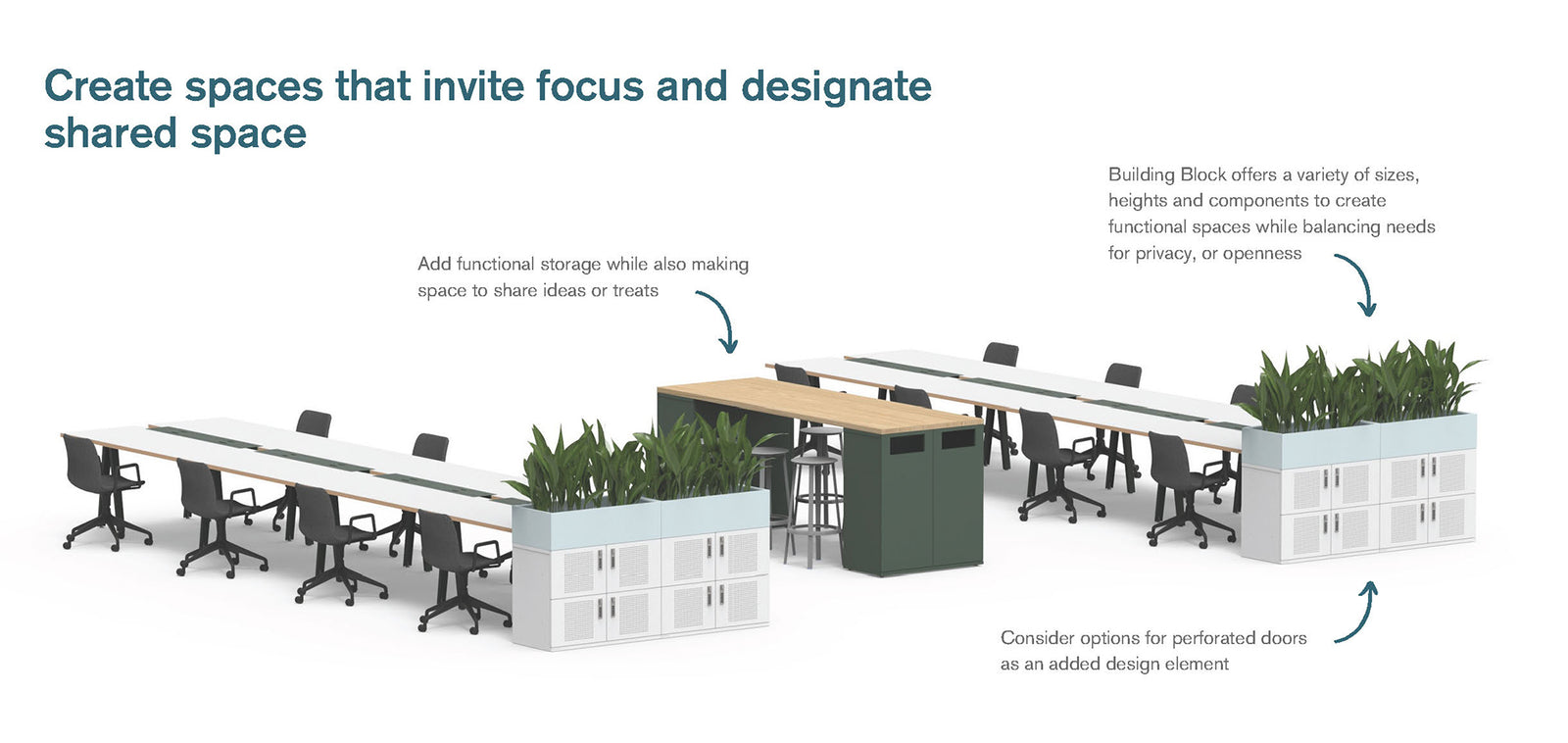 • Add a laminate surface to make space for individual touchdown or team collaboration