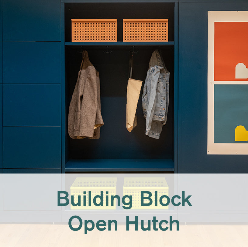 • Building Block Open Hutch offers easy-access personal storage with hooks to hold jackets or bags