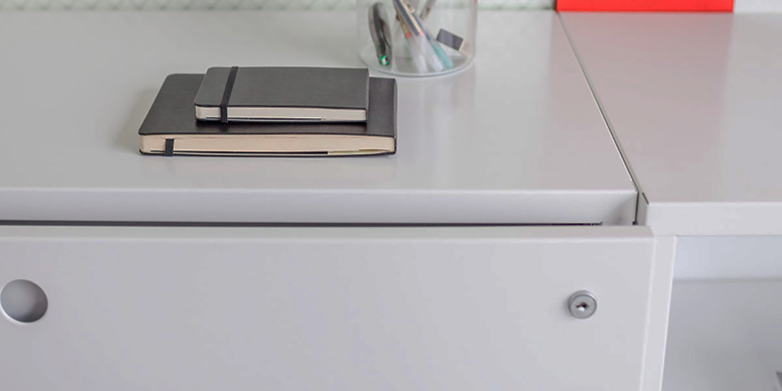 The Building Block Lateral File comes with two full-extension, interlocking drawers with heart-shaped keys.